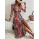 Kadın Kısa Kollu V Yakalı Desenli Yandan Yırtmaçlı Süprem Elbise