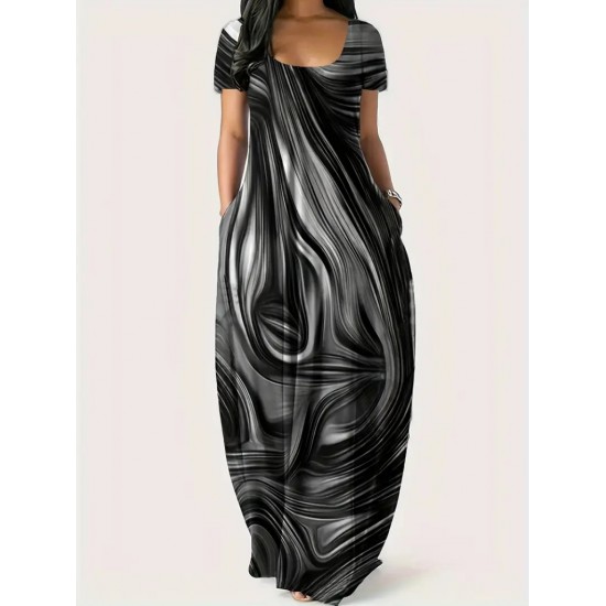 Kadın Kısa Kollu Yuvarlak Yaka Cepli Salaş Baskılı Süprem Elbise, 23546